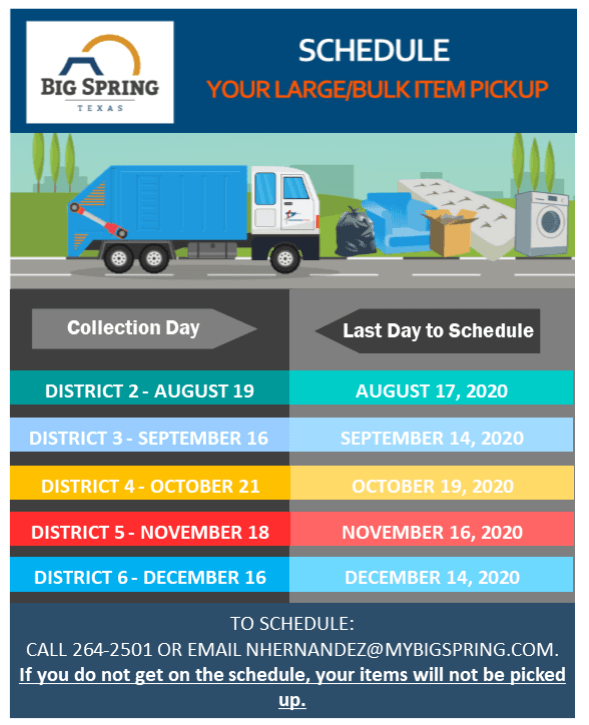 This year the City of Big Spring’s LARGE/BULK ITEM PICKUP will take place on the third Wednesday of every month in 2020, according to the dates on the schedule provided. For questions concerning Large/Bulk Item Pickup, please visit the link below or call the Public Works Office at 432-264-2501.
